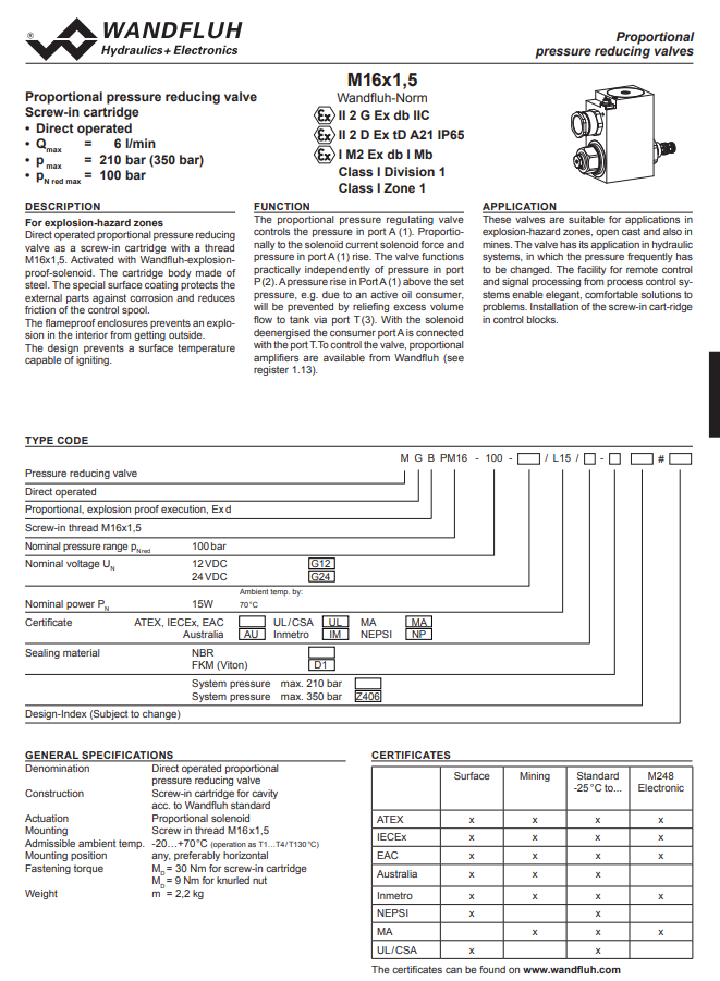 Proportional pressure reducing cartridge direct operated Explosion proof Ex d II C MGBPM16-Wandfluh