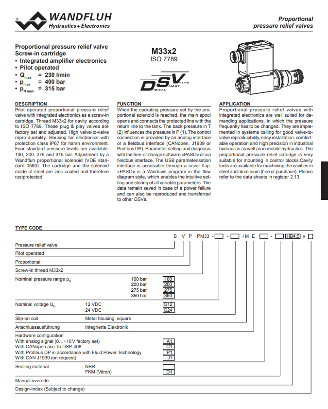 Proportional pressure relief cartridge pilot operated (slip-on-coil, integrated electronics) BVPPM33_ME-Wandfluh