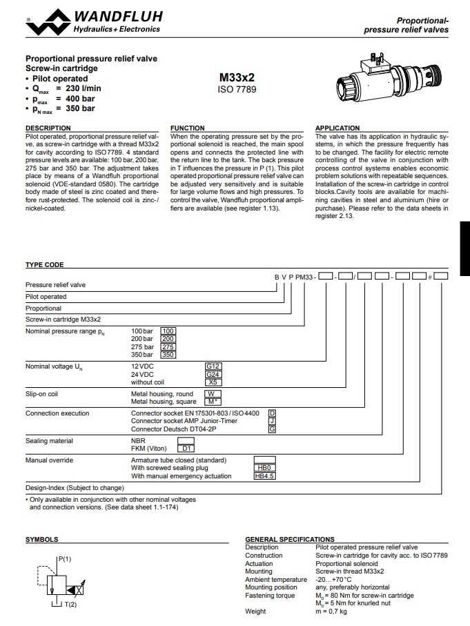 Proportional pressure relief cartridge pilot operated (slip-on coil) BVPPM33-Wandfluh