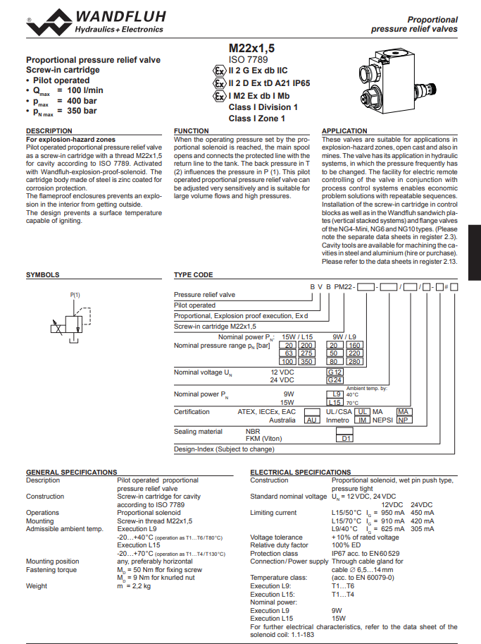 Proportional pressure relief cartridge pilot operated explosion proof Ex d II C BVBPM22-Wandfluh