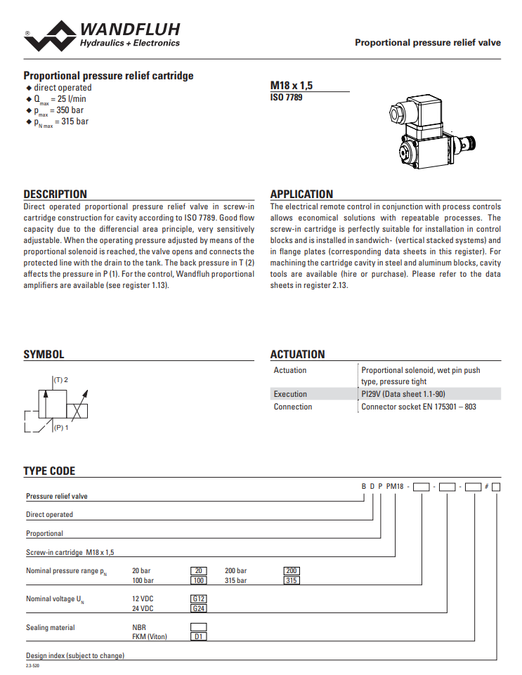 Proportional pressure relief cartridge direct operated BDPPM18-Wandfluh