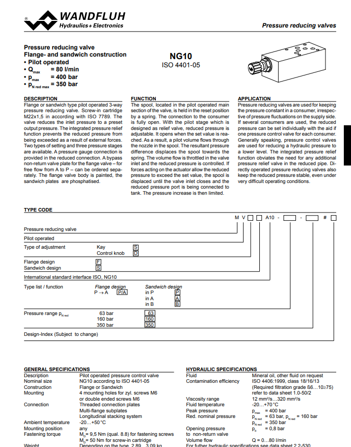 Pressure reducing flange and sandwich construction pilot operated MV_S_FA10-Wandfluh