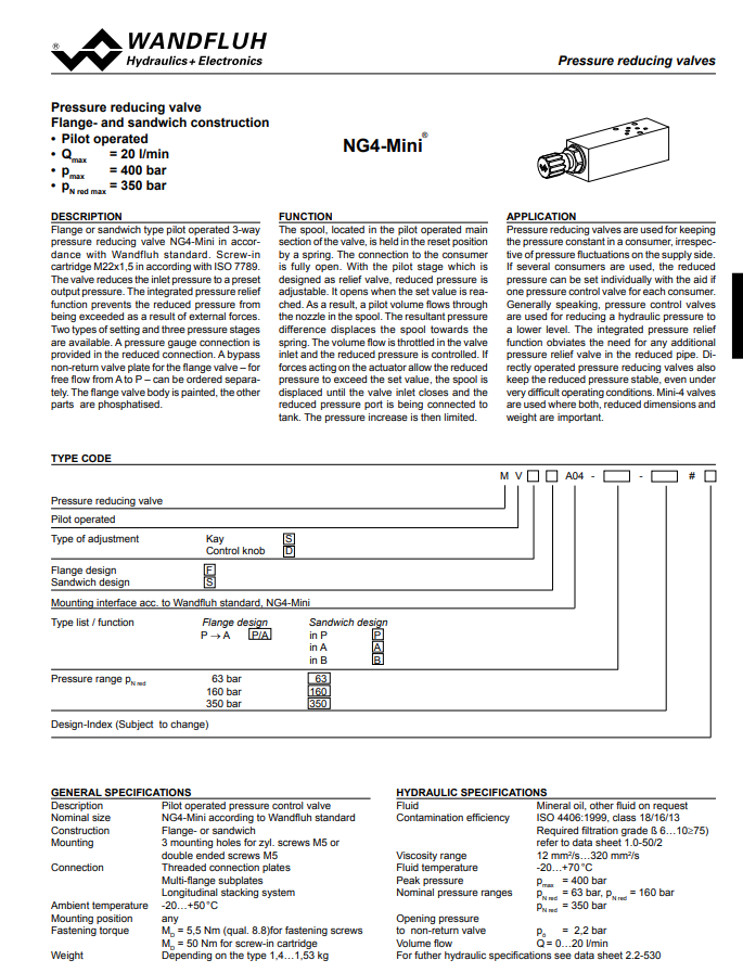 Pressure reducing flange and sandwich construction pilot operated MV_S_FA04-Wandfluh