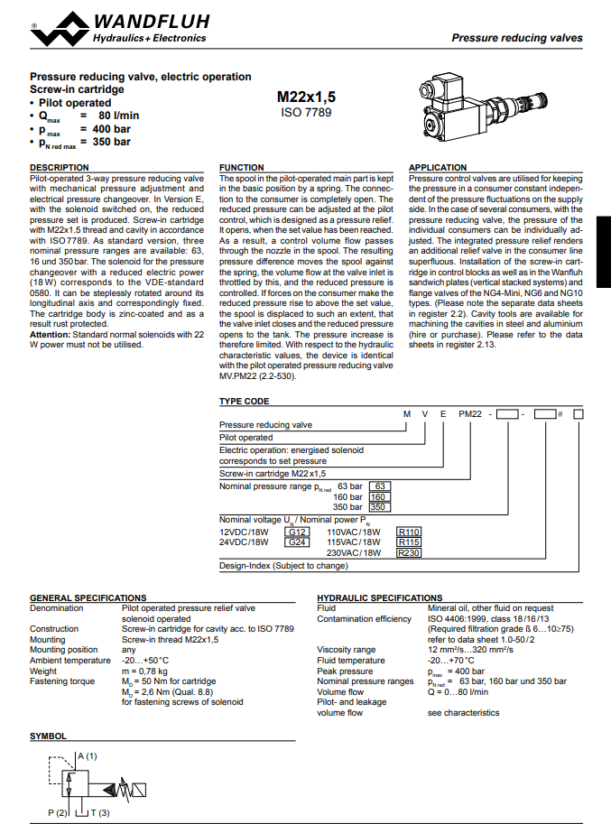 Pressure reducing cartridge pilot operated electric vented MVEPM22-Wandfluh