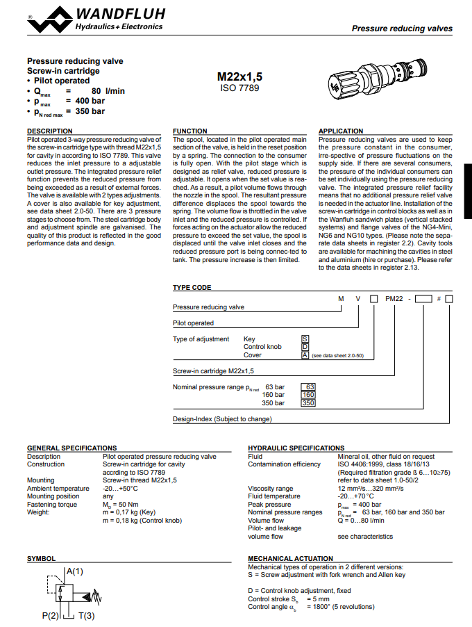 Pressure reducing cartridge pilot operated MV_PM22-Wandfluh