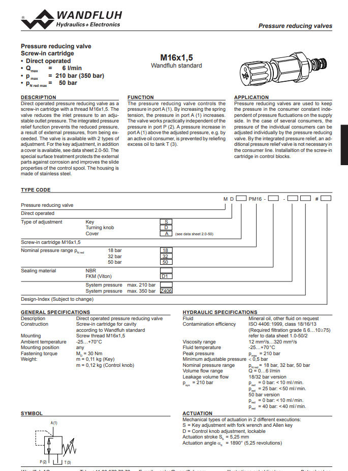 Pressure reducing cartridge direct operated MD_PM16-Wandfluh