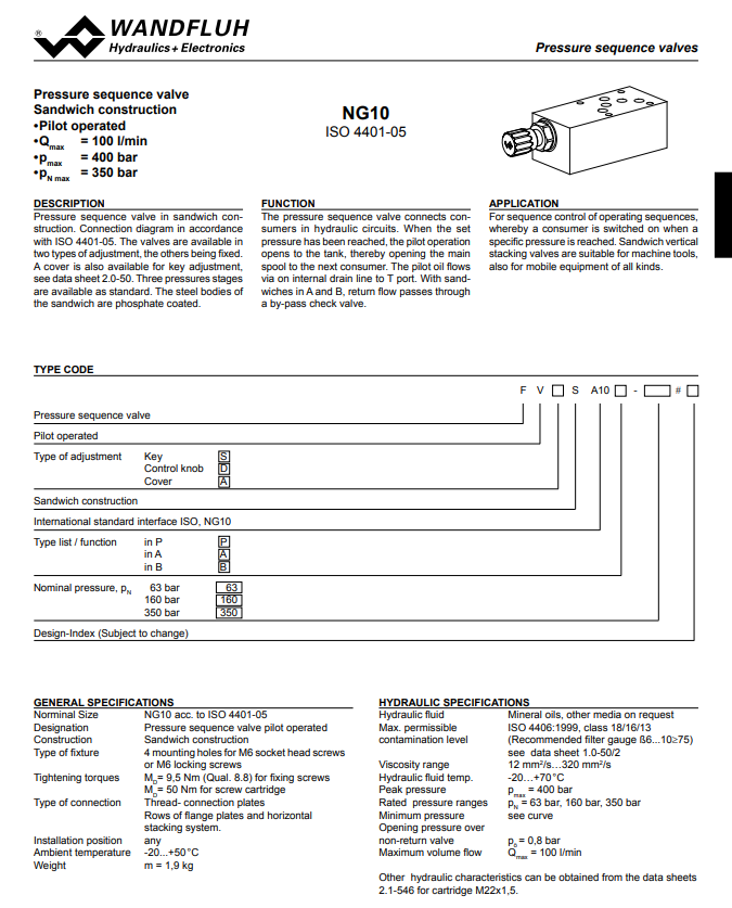 Pressure sequence valve sandwich construction pilot operated FV_SA10-Wandfluh