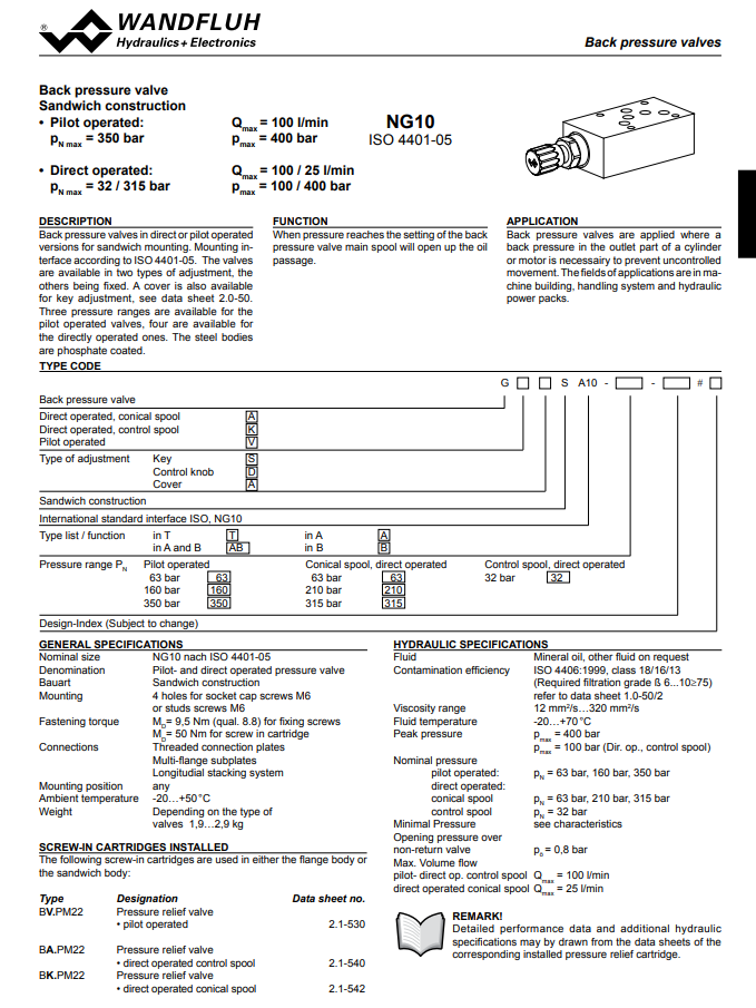 Backpressure valve sandwich construction pilot/direct operated G_SA10-Wandfluh