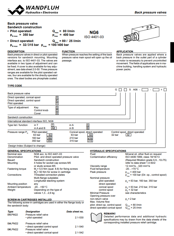 Backpressure valve sandwich construction pilot/direct operated G_SA06-Wandlfluh