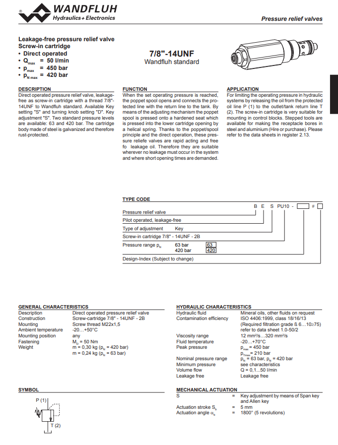 Pressure relief cartridge direct operated leakage free BESPU10-Wandfluh