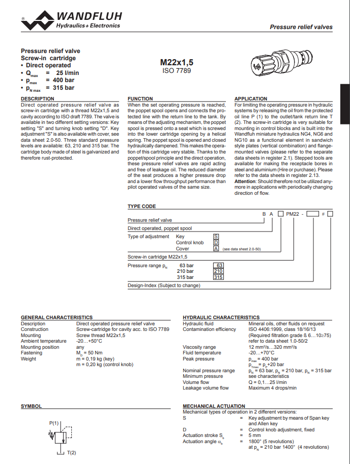 Pressure relief cartridge direct operated BA_PM22-Wandfluh