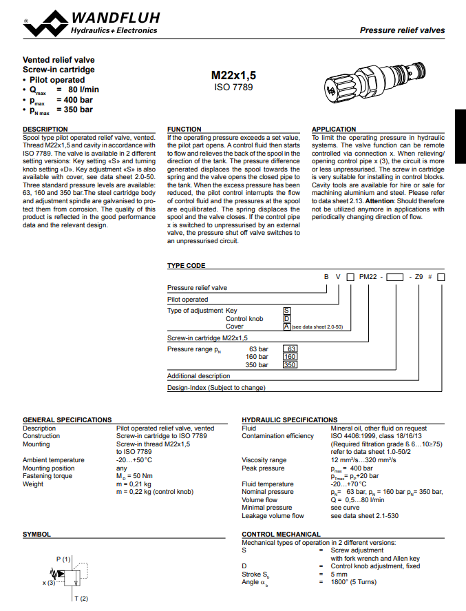 Pressure relief cartridge pilot operated hydraulic vented BV_PM22_Z9-Wandfluh