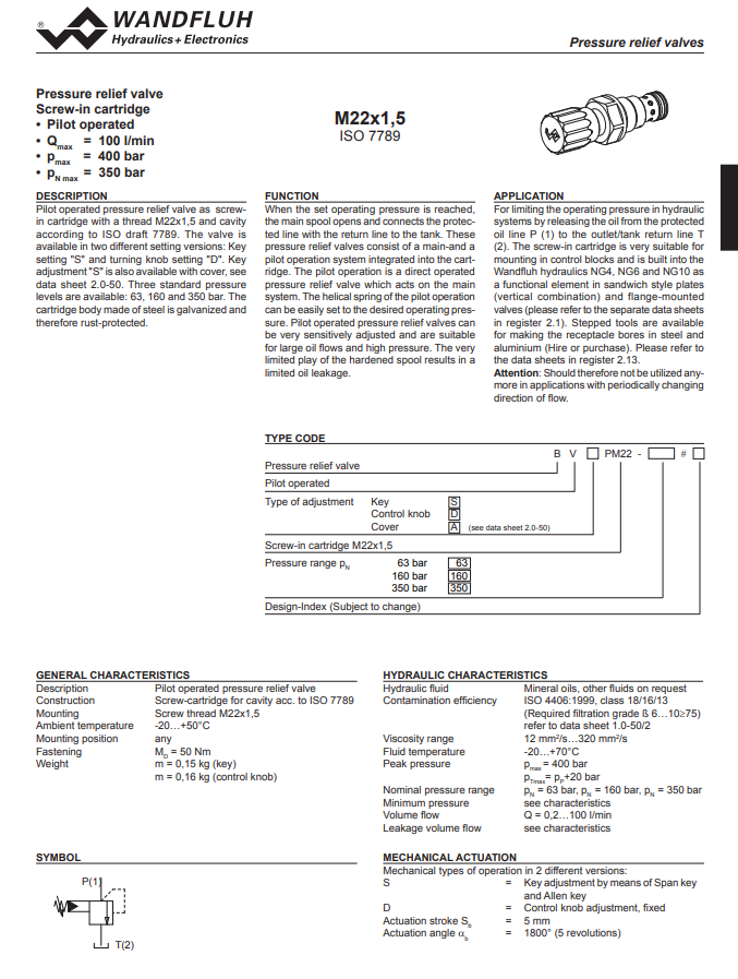 Pressure relief cartridge pilot operated BV_PM22-Wandfluh