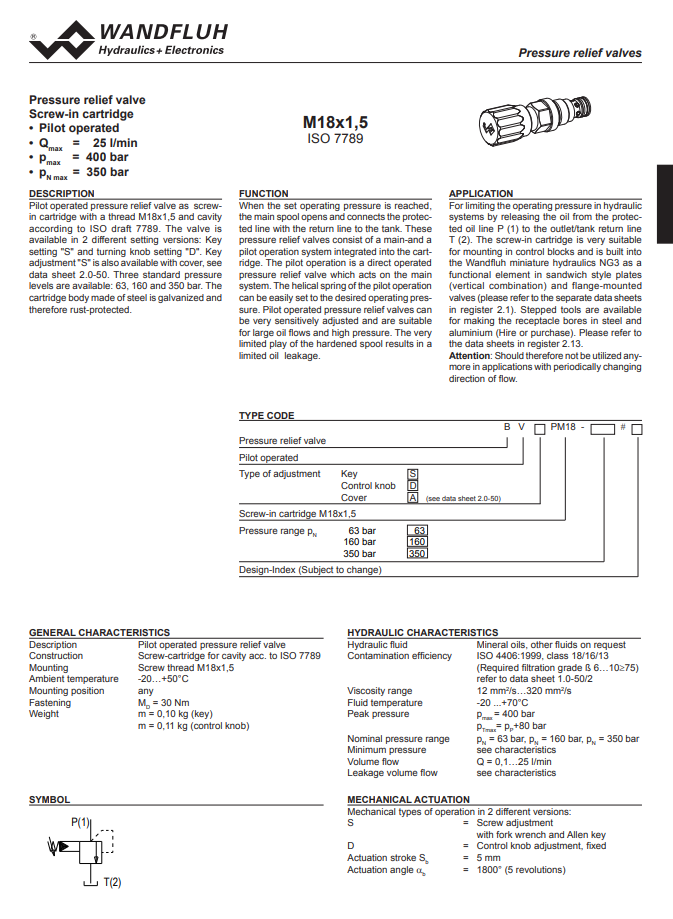 Pressure relief cartridge pilot operated BV_PM18-Wandfluh