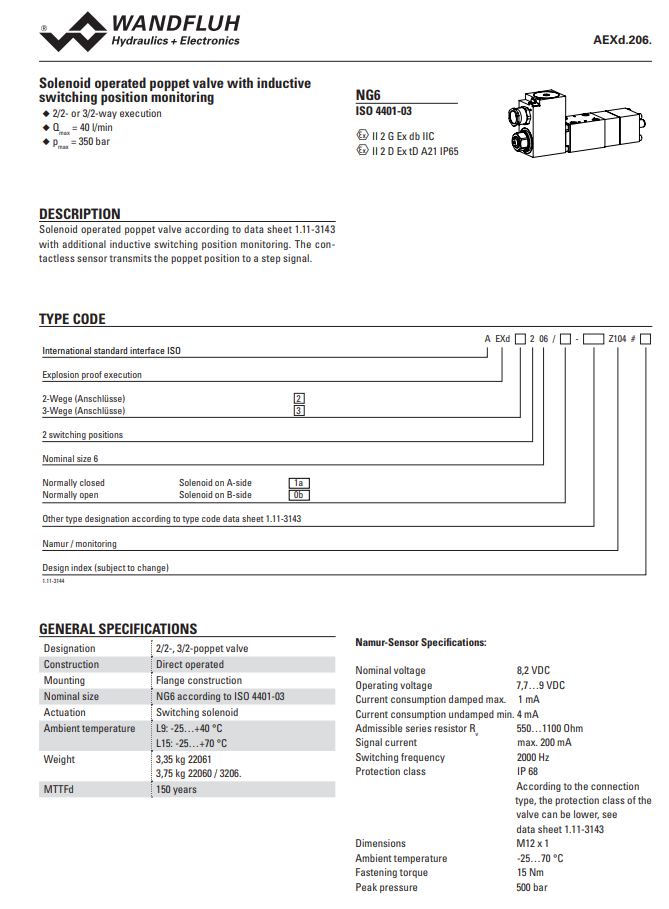 Solenoid poppet valve with inductive switching position monitoring AEXd_206_Z104-Wandfluh
