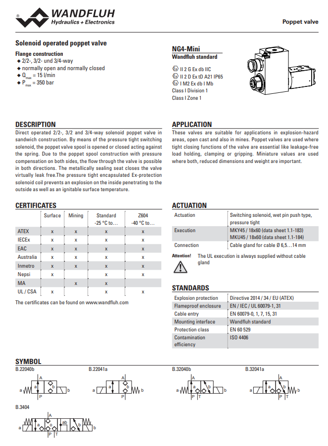 Solenoid poppet valves explosion proof flange construction Ex d II C BEXd2204-Wandfluh