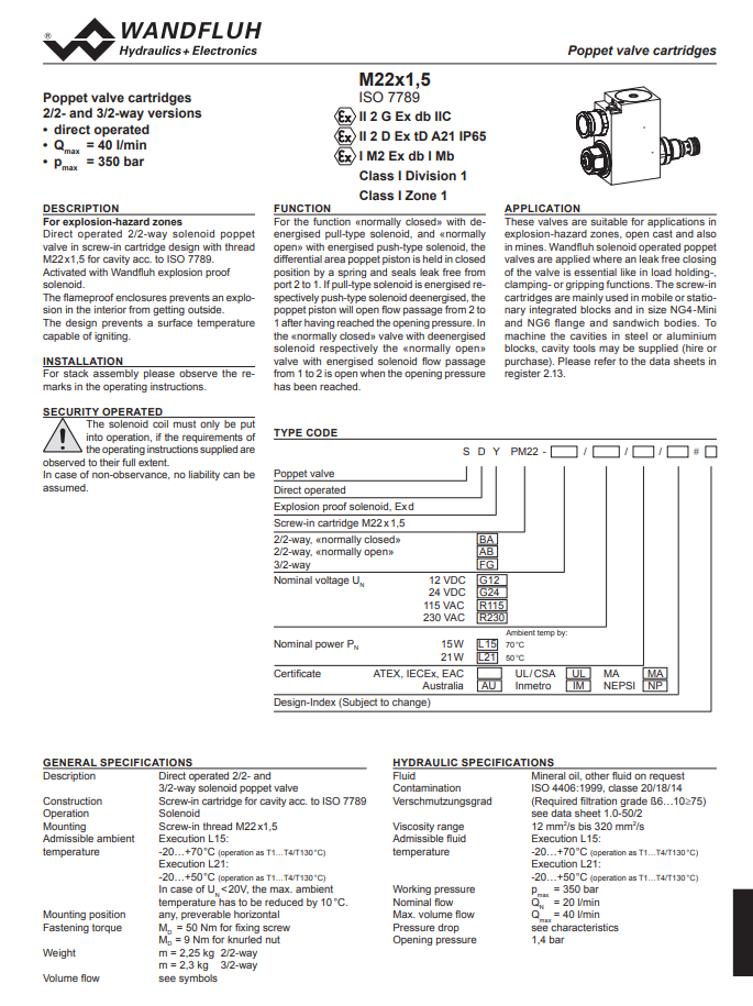 Solenoid poppet valve cartridge direct operated explosion proof Ex d II C SDYPM22-Wandfluh
