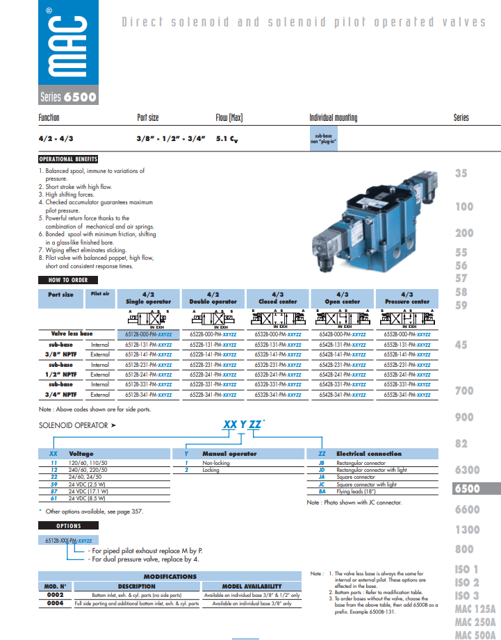 Van điện từ MAC series 6500 model: 6512B-000-PM~ 6552B-341-PM. Là dòng van kiểu 4/2 và 4/3 size van từ 3/8’’ ~ 3/4’’ trạng thái van 2 vị trí và3 vị trí, điện áp 24VDC ~ 220VAC.