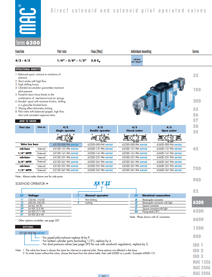 Van điện từ series 6300 model: 6312D -000-PM ~ 6342D-341-PM là dòng van kiểu 4/2 và 4/3 sử dụng 1 coil và coil điện size van 1/4’’ đến 1/2’’ điện áp 24VDC ~ 240 VAC.