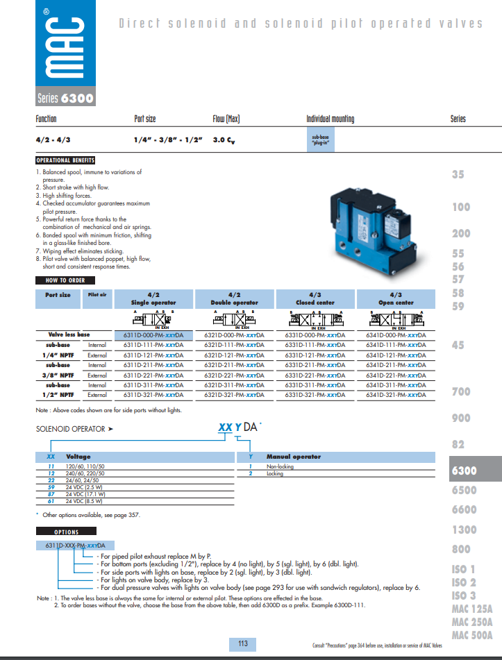 Van điện từ series 6300 model: 6311D-000-PM ~ 6341D- 321-PM là dòng van kiểu 4/2 và 4/3 size van từ 1/4’’ đến 1/2’’ điện áp 24VDC ~ 240VAC thiết kế nhỏ gọn nằm trên đế.