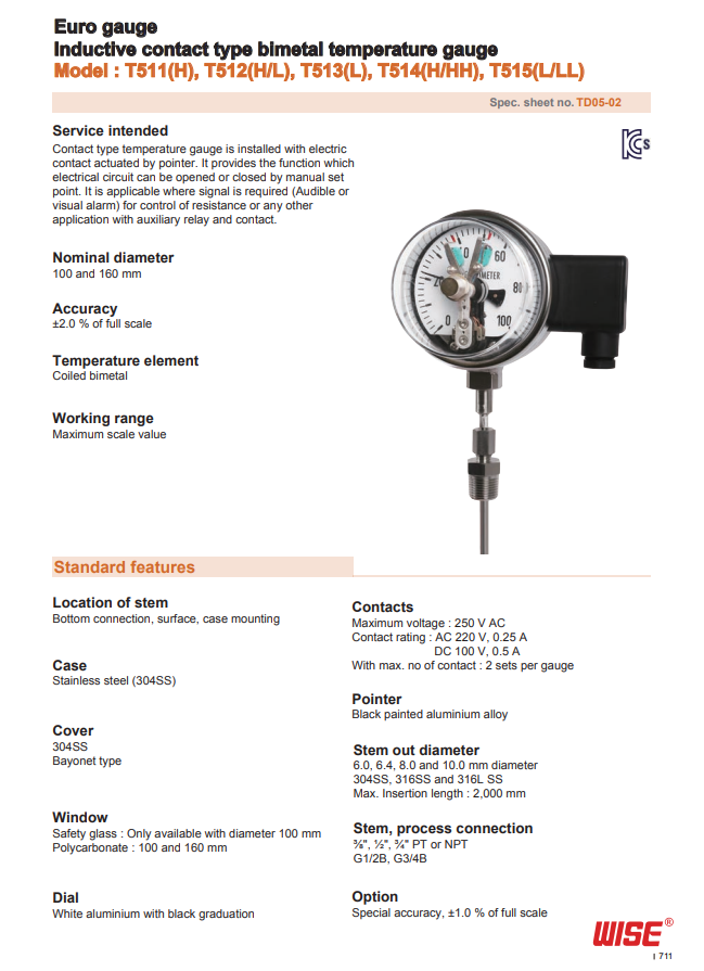 Đồng hồ nhiệt model: T511, T512,T513, T514, T515 - WISE