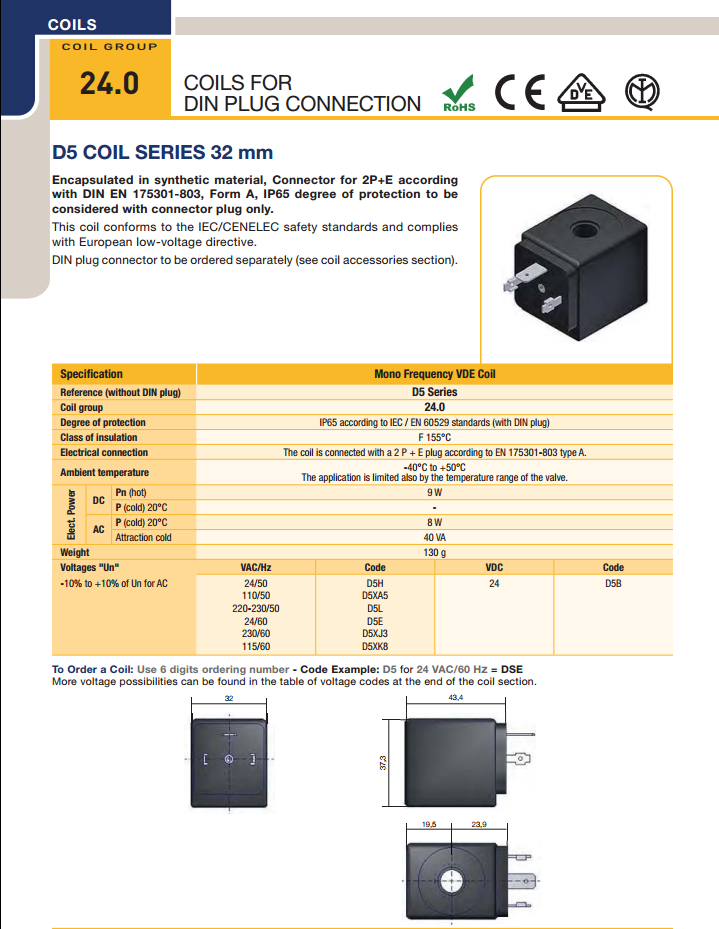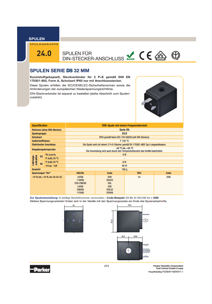 Coil điện Parker D5 series 32 mm