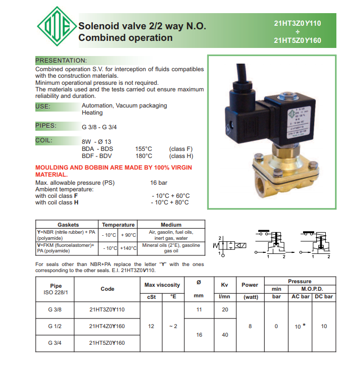 Van điện từ ODE: 21HT3Z0Y110 ~21HT5Z0Y160 là dòng van thân vật liệu đồng, kiểu van 2/2 trạng thái van thường mở ( NO) van sử dụng nhiệt lên đến 1800C, áp lực 16 bar sử dụng cho hệ thống chân không và đóng gói chịu nhiệt.