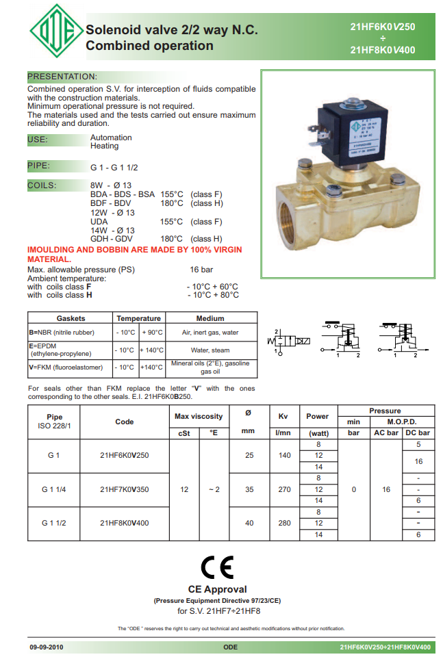 Van điện từ ODE: 21F6K0V250 ~ 21HF8K0V400. Là dòng van thân vật liệu đồng, kiểu van 2/2, trạng thái van thường đóng ( NC) nhiệt độ van 1800C, áp lực 16 bar sử dụng: Nước, khí, dầu, gas, hơi .