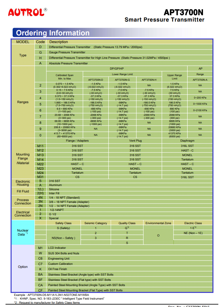Pressure transmitter: APT3700N-H