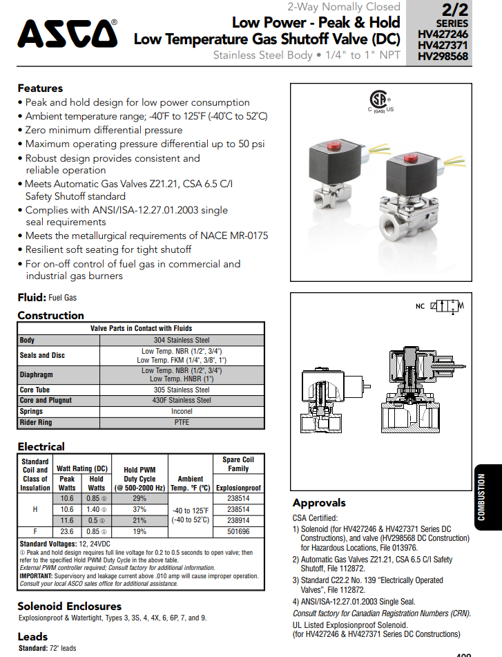 ASCO Gas shutoff valve series: HV427246, HV427371, HV298568