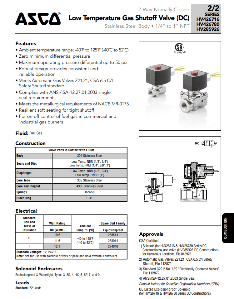 ASCO Gas shutoff valve series: HV426716, HV426780, HV285926