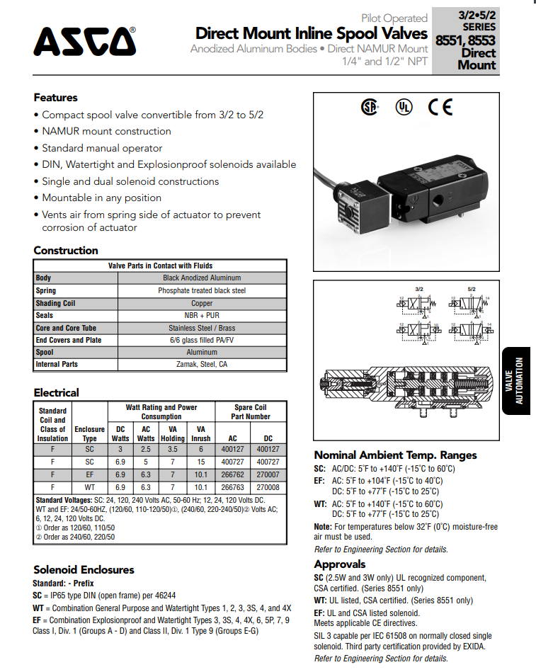 ASCO Direct solenoid valve series: SC8551, SC8553, WT8551, WT8553, EF8551,EF8553