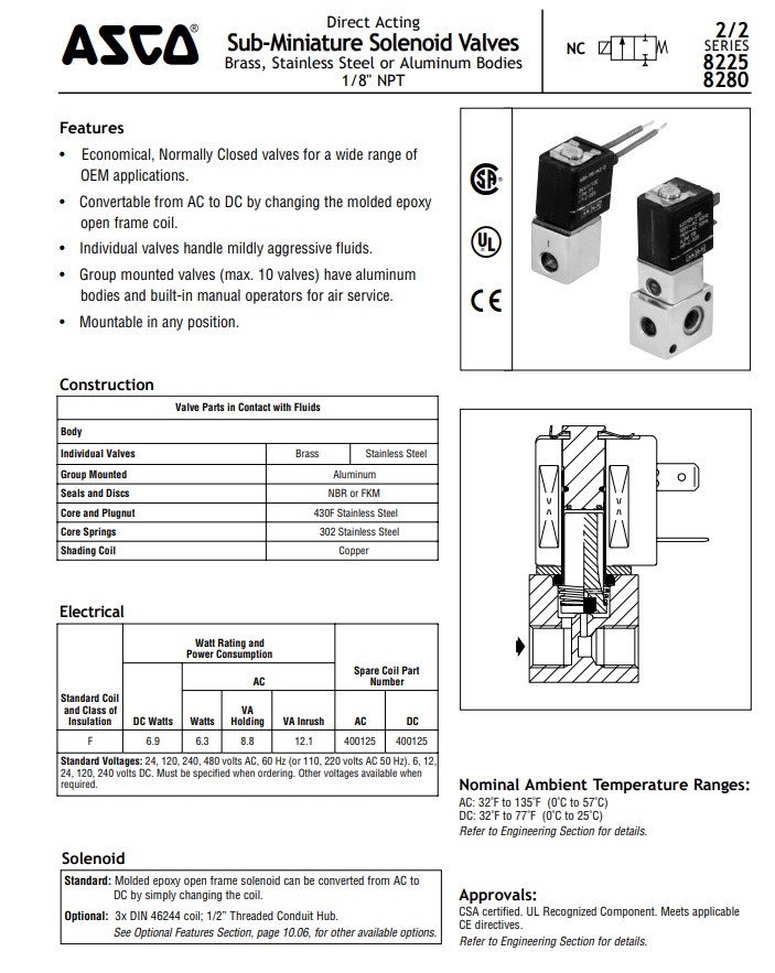 ASCO Sub-miniature solenoid valve series: 8225, 8280