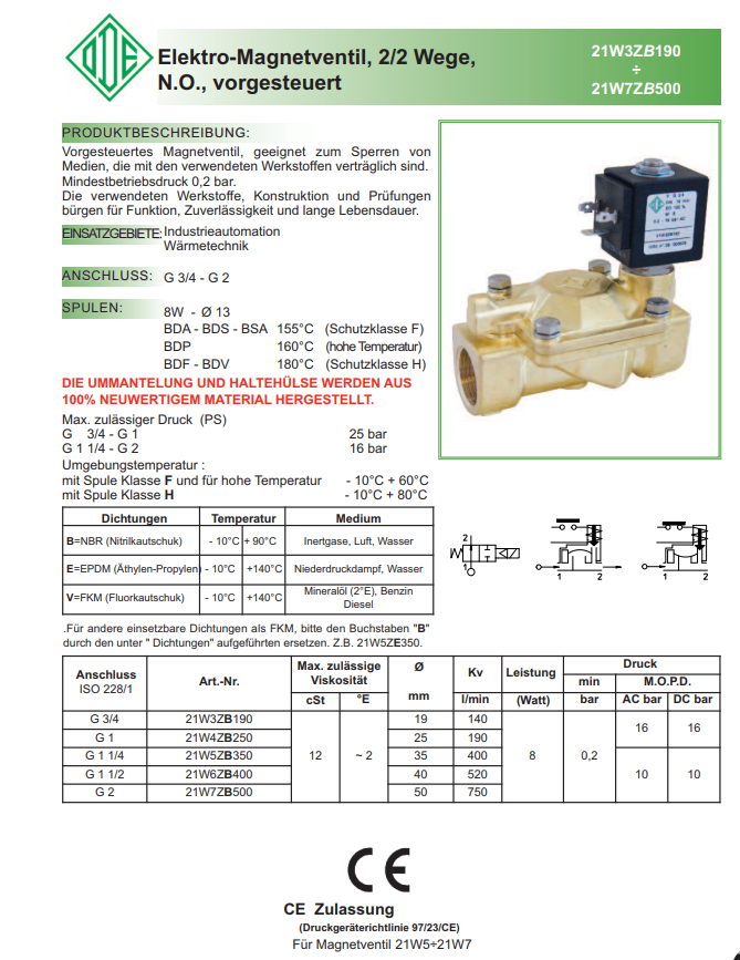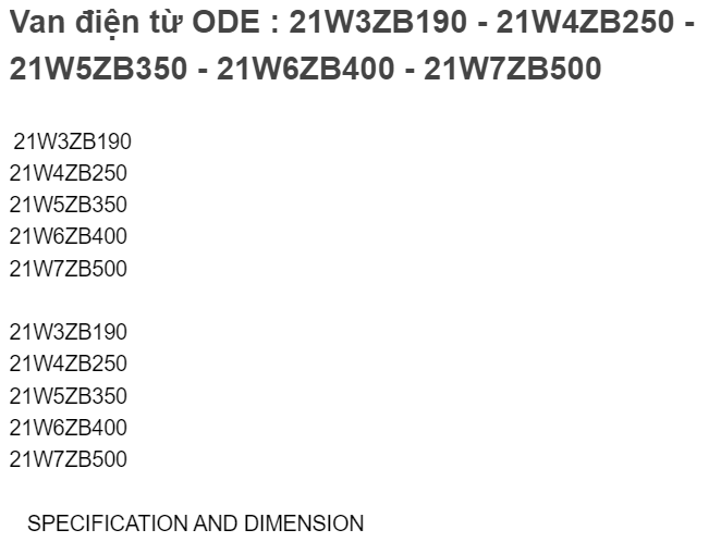 Van điện từ ODE : 21W3ZB190, 21W4ZB250, 21W5ZB350, 21W6ZB400, 21W7ZB500