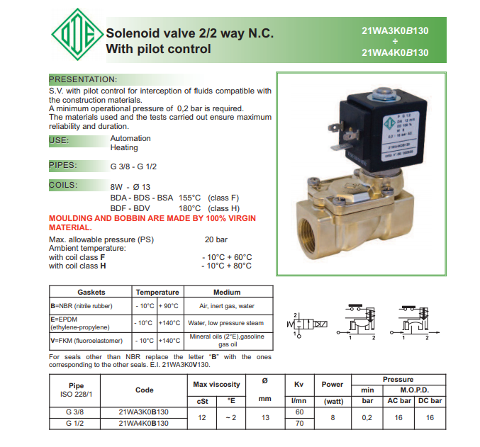 Van điện từ ODE : 21WA3K0B130, 21WA4K0B130, 21WA3K0B130-M, 21WA4K0B130-M