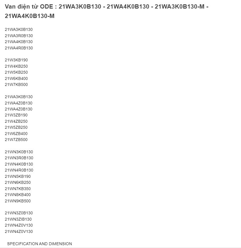 Van điện từ ODE : 21A3KV15, 21A3KV20, 21A3KV25, 21A3KV30, 21A3KV45, 21A2KV15, 21A2KV20, 21A2KV25, 21A2KV30, 21A2KV45, 21A2KV55