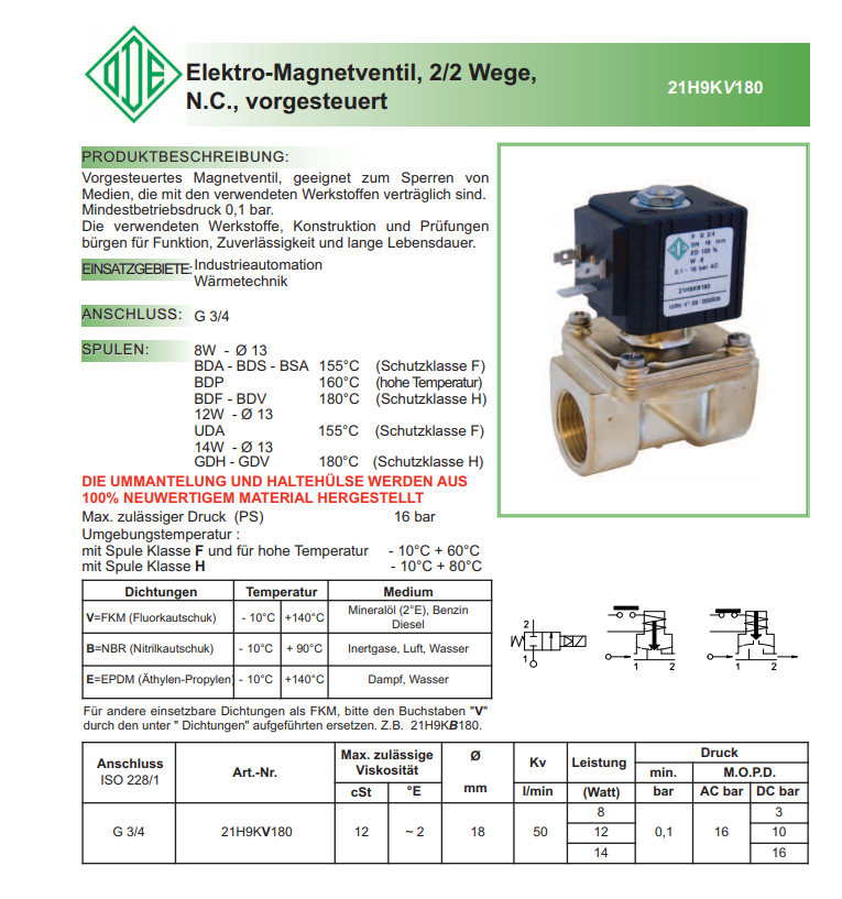 Van điện từ ODE : 21H9KB180, 21H9KV180, 21H9KE180