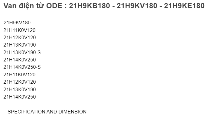 Van điện từ ODE : 21A3KV15, 21A3KV20, 21A3KV25, 21A3KV30, 21A3KV45, 21A2KV15, 21A2KV20, 21A2KV25, 21A2KV30, 21A2KV45, 21A2KV55