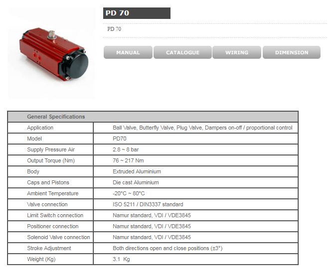 - Kiểu: ON/ OFF (0~900) : Modulating ( Tín hiệu Input – output 4 ~ 20mA)