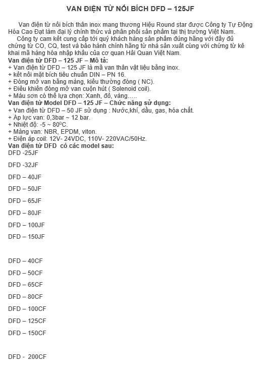 Van điện từ DFD – 125 JF – Thông số kỹ thuật: