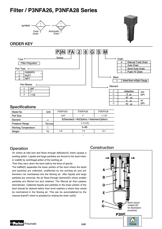 Cốc lọc Model P3NFA có chức năng tách nước và lọc bẩn của khí nén. Khí đi vào cửa cấp thông qua lõi lọc trong cốc sau đó nước và bụi bẩn bị giữ lại trong cốc còn khí sạch theo cửa theo cửa thoát ra ngoài đi sử dụng. Nước và bụi bẩn còn lại được cốc lọc tự xả ra ngoài theo van báo mức hoặc xả theo chỉ định của người vận hành.