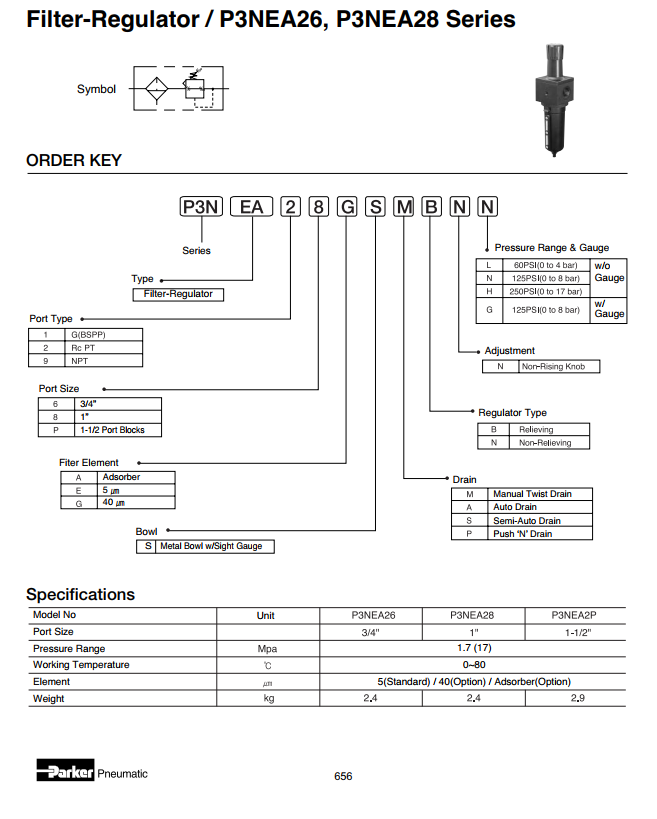 Model P3NEA là bộ lọc đơn gồm có cốc lọc tách nước điều áp khí và đồng hồ báo áp lực.