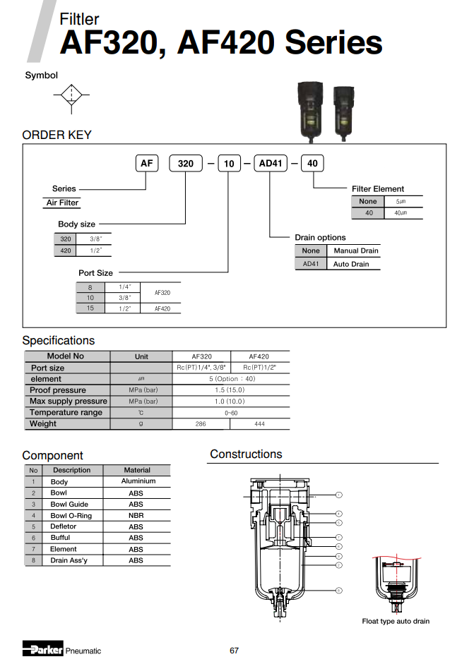 Model: AF là cốc lọc bẩn và tách nước cho khí nén làm tăng tuổi thọ của van, xi lanh và hệ thống dùng khí khác.