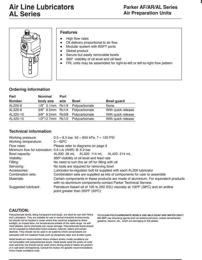 Model AL có tên gọi trong chuyên ngành khí nén là cốc dầu, cốc dầu có chức năng theo khí đi dưới dạng sương mù để bôi trơn cho hệ thống cơ cầu chấp hành.