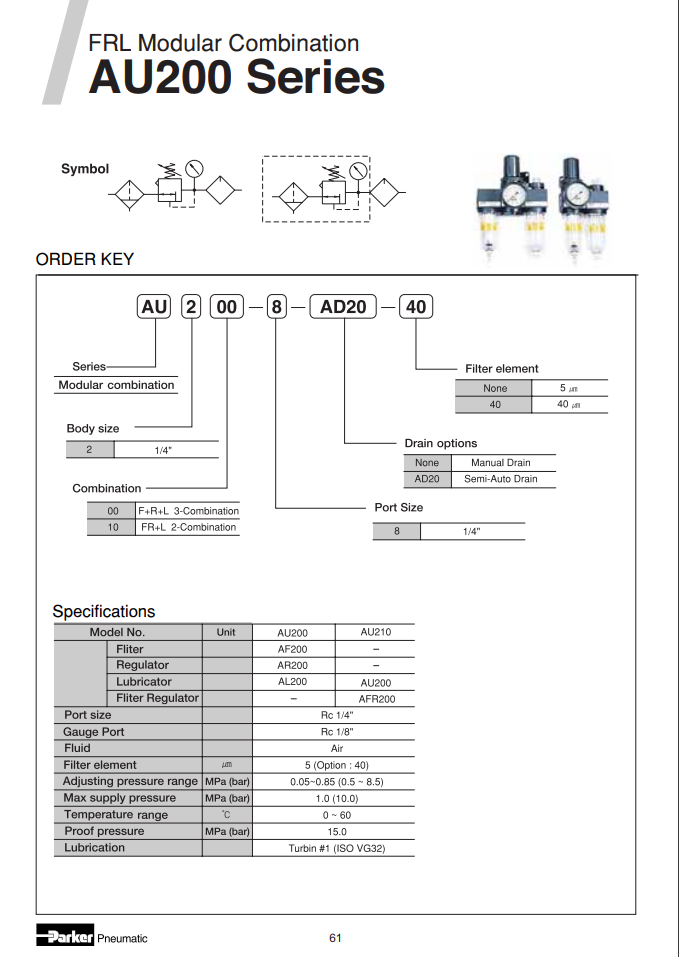 Model AU có chức năng lọc tách nước, tách bẩn sau đó khí được điều chỉnh áp lực cần thiết và mang theo dầu dưới dạng sương mù đi bôi trơn, bảo vệ van và xi lanh khí.