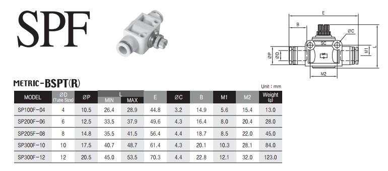 Van tiết lưu SPF: Là loại van tiết lưu trực tiếp có 1 đầu cắm nhanh đưa khí vào 1 đầu ren để bắt trực tiếp vào xi lanh hoặc thiết bị khác, chức năng như một van tiết lưu để điều chỉnh dòng khí nhanh hay chậm.