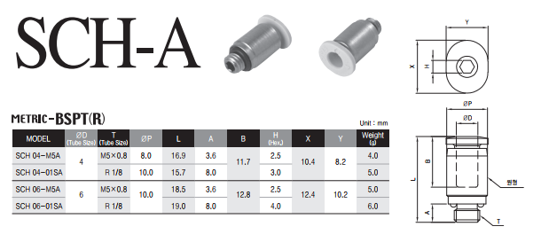 Đầu nối SCH - A có kiểu dáng compact nhỏ gọn thao tác nhanh dễ dàng cắm ống cũng như tháo ống.