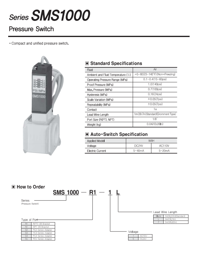 Công ty Thiết bị Tự Động Hóa Cao Đạt xin trân trọng giới thiệu tới quý khách hàng công tắc áp suất series SMS 1000 hiệu TPC Koera.
