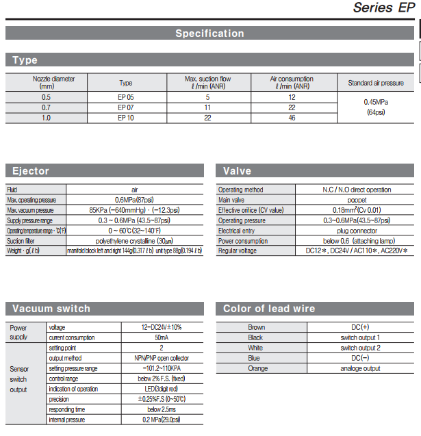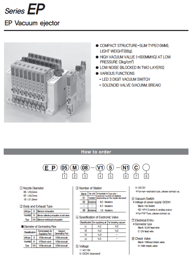 Bộ van phun chân không series EP- Lựa chọn đơn hàng và thông số kỹ thuật: