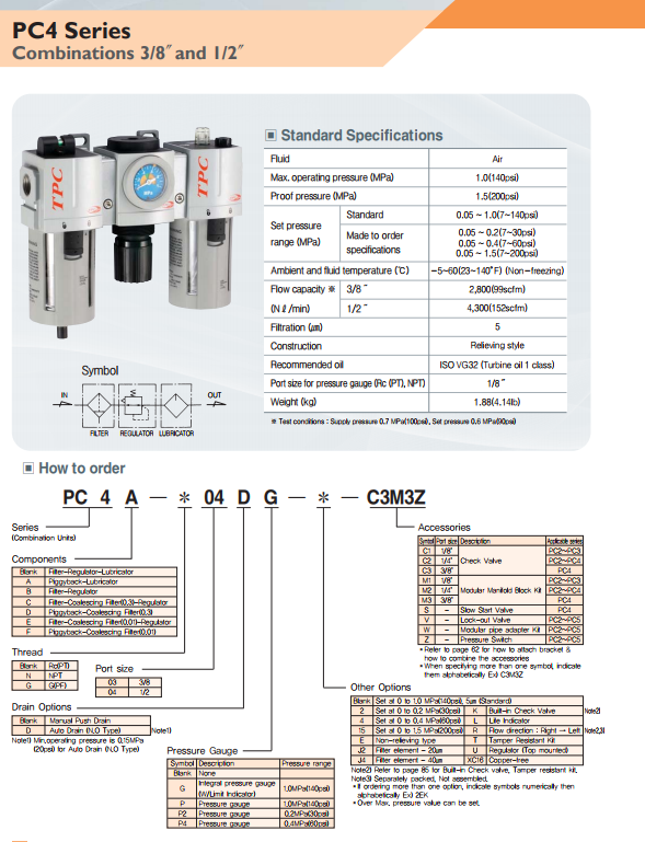 Bộ lọc đôi PC4A có chức năng lọc sạch khí, điều chỉnh áp lực và trộn dầu thành sương mù đưa khí đi sử dụng.